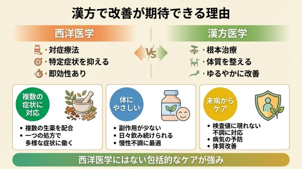 例えば「関節が痛くて胃腸の調子も悪い」という場合に、一種類の漢方薬で関節痛と胃腸症状の両方に働きかけることも可能です。このような包括的なケアは、西洋医学の単一成分の薬にはない漢方の強みと言えるでしょう。