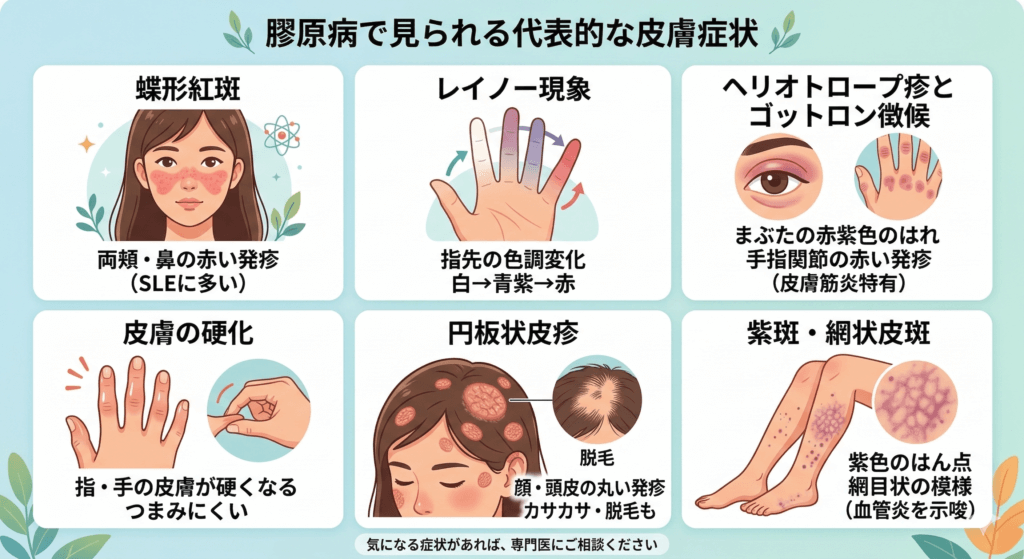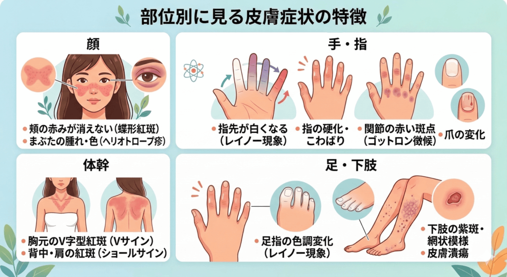 この記事では、膠原病で見られる代表的な皮膚症状を部位ごとにわかりやすく解説します。