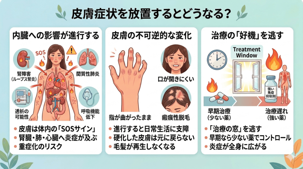 皮膚症状を放置するということは、膠原病そのものの治療を遅らせることを意味します。